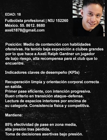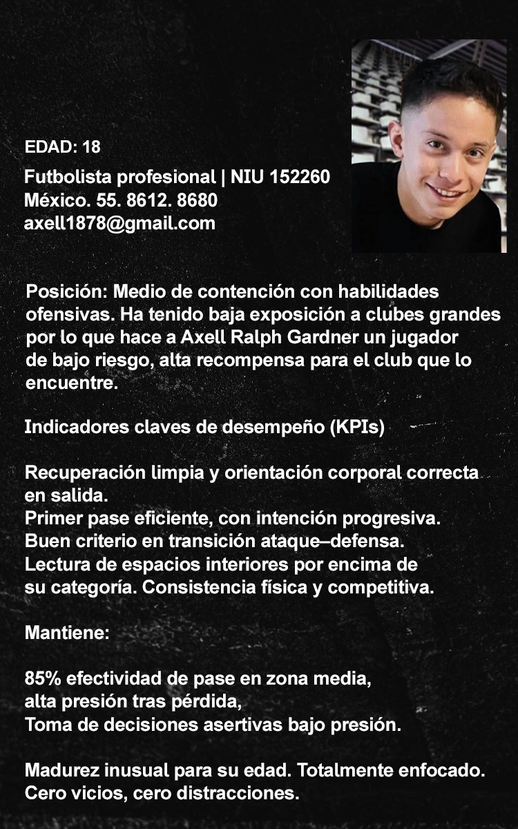 Axell Ralph Gardener: 18 años | Medio de Contención | CDMX El medio de contención con importantes atributos ofensivos que juega con cabeza de veterano y hambre de debutante En un fútbol mexicano donde cada vez escasean los creativos naturales, surge Axell Ralph Gardener, un mediocampista de 18 años que juega como si ya hubiera vivido 200 partidos en Primera División. Ubicado como contención, pero con alma de “10” clásico, Axell pertenece a esa estirpe de futbolistas que leen el partido antes de que el balón llegue a sus pies.